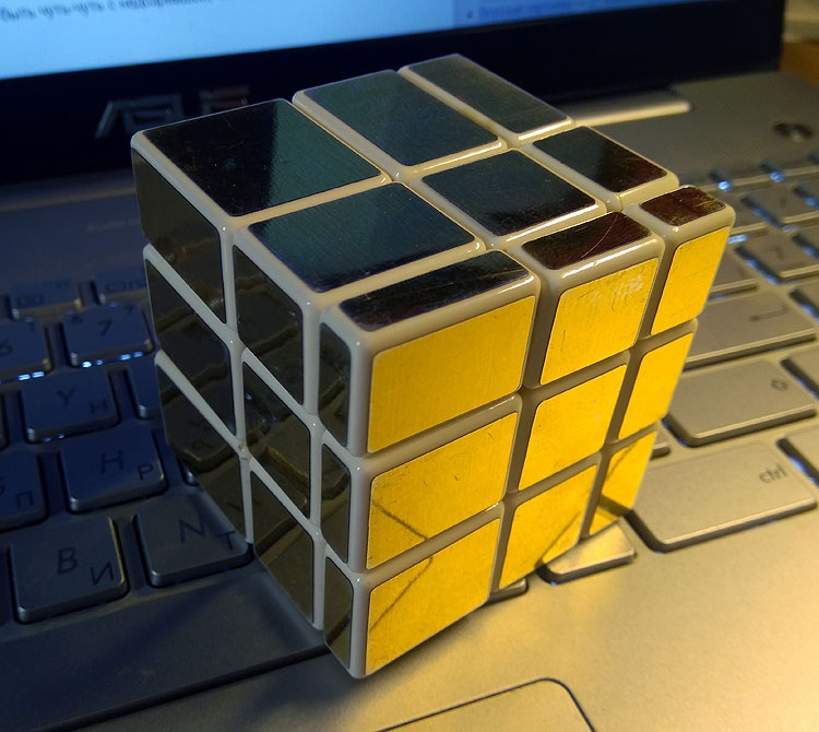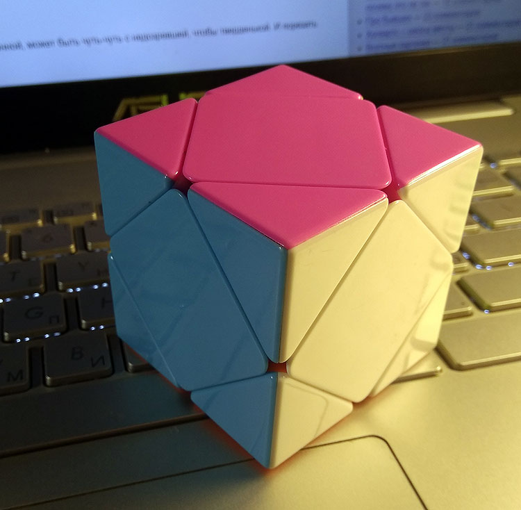 Сложность состояла в том, что представлять себе в такой зикозябре куда что движется достаточно сложно. И постоянно держать в уме, что вот этот вот центр грани на самом деле уголочек верхней грани кубика, а вот это вот движение по диагонали – это простое движение передней грани кубика. И так далее.