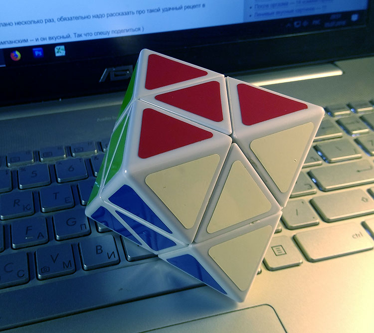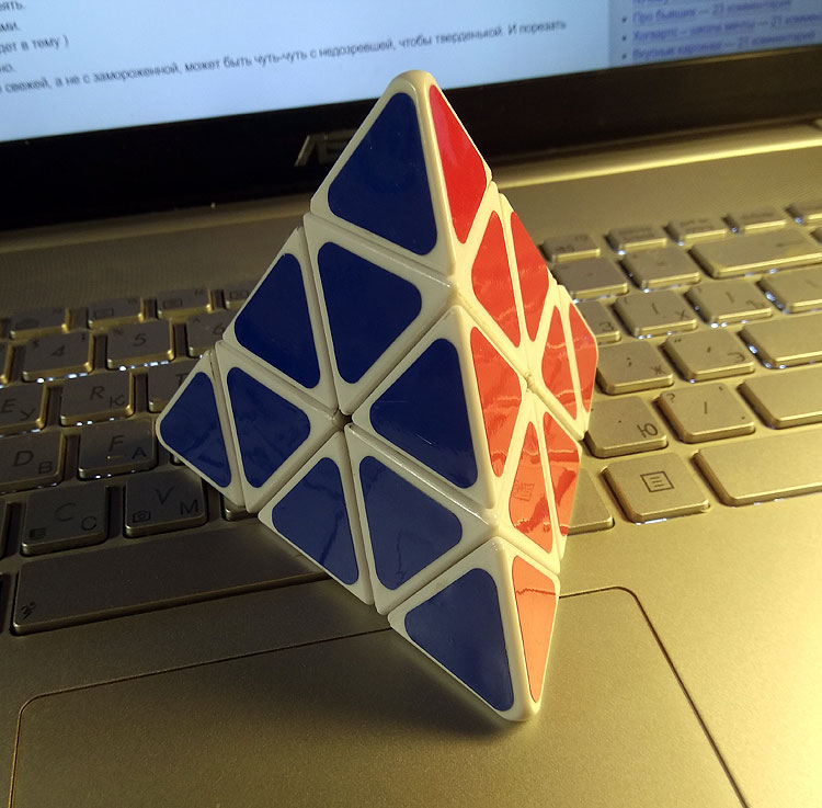 Достаточно быстро стало понятно, что эта новая головоломка похожа по сборке на кубик Рубика! Надо представить себе, что ребра этой пирамидке – это как бы грани кубика.