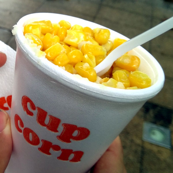 А еще бывает, конечно, еда местная. Местная даже интереснее. (Хотя “быстрая” тоже интересно – она всегда с местными особенностями. Например, у нас шаурму всегда готовят в тонком, но большом по площади лаваше; тут шаурму всегда готовят в такой толстенькой лепешке, гораздо меньшей площади). Или вот особенная здешняя быстрая еда, какую я пока не встречала – кукуруза не в початке, а зернами.