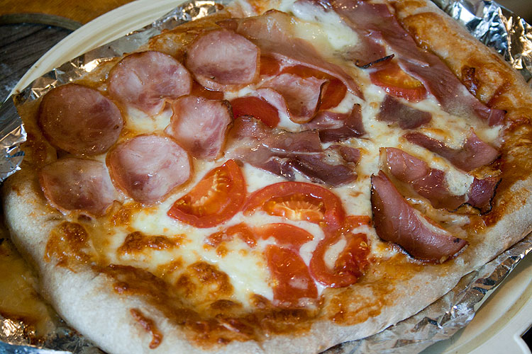 Поскольку вкусов гостей я не знала, пиццу делала одновременно с разными начинками: колбаса, прошутто крудо и без мяса. Мои, впрочем, такие же – любят, когда я готовлю пиццу не с одной начинкой, а с разными (Денису – колбаса, папе – прошутто, Антону без мяса). А гости, кажется, не смотрели на начинку, оказались всеядные ))