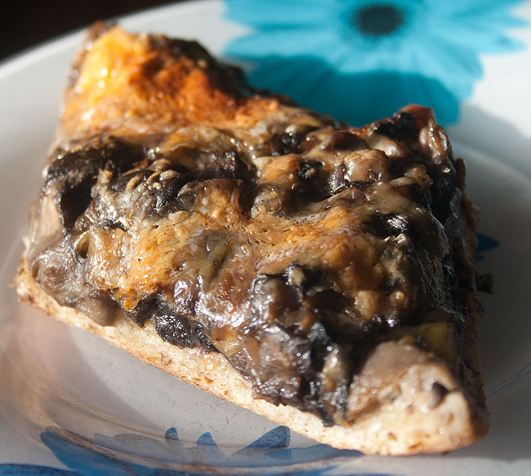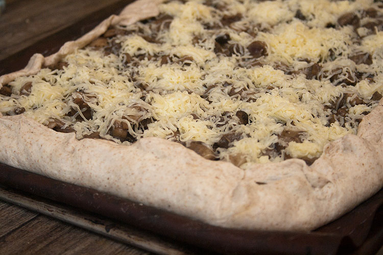 Из остатков теста испекла пирог. Гости, когда у нас были, закупили тут на местном базарчике грибы. А на грибы, надо сказать, тоже урожай, покруче чем на помидоры, видимо. И так меня гости грибами раздразнили, что я тоже купила грибов.