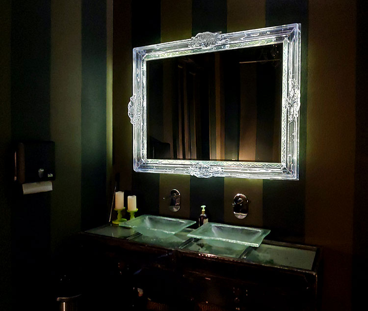 Оформление ресторана осталось со времен дорогущего “Женатого француза”. Например, на фото выше оформление женского туалета.