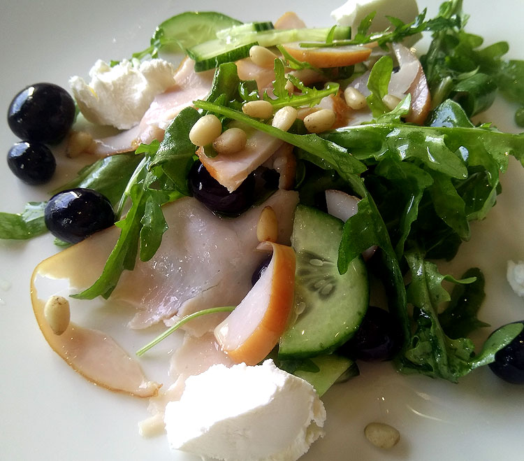Этот салат называется очень просто – салат с копченой индейкой, руколой и виноградом. Меня так радуют честные салаты которые сразу перечисляют, что в них входит. Но конкретно в этот очень приятную пикантную нотку вносят кедровые орешки.