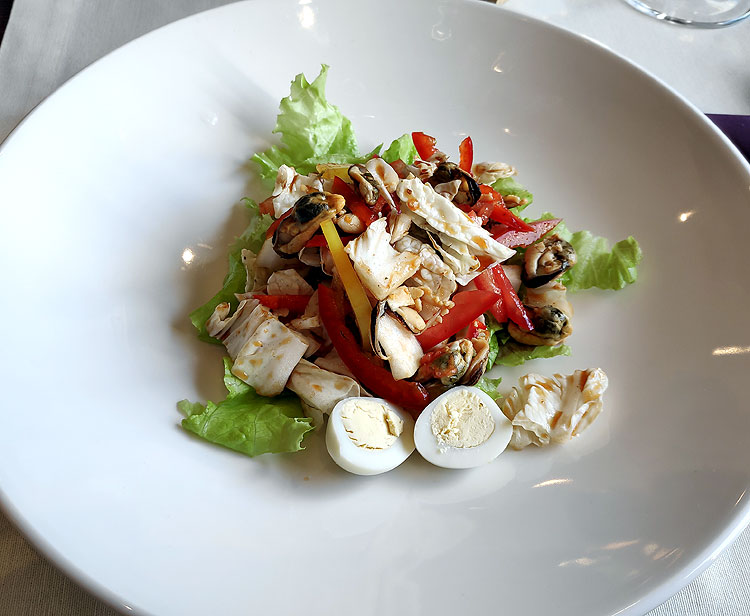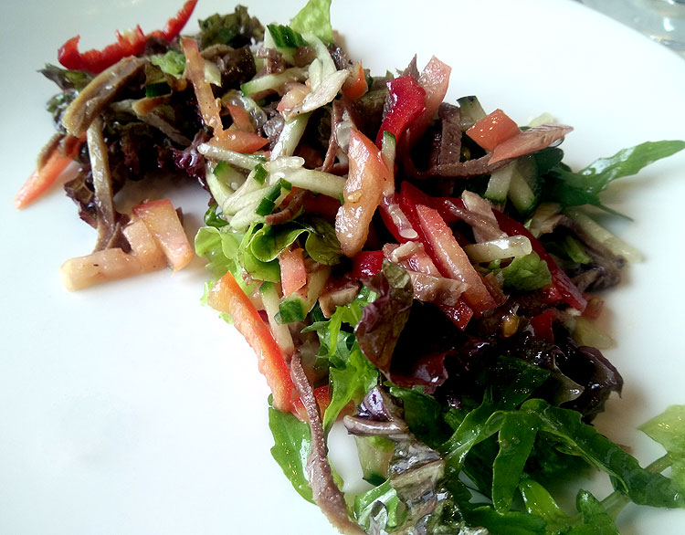 Мама отмечала тут свой день рождения с подругами. На четверых с вином и десертами они потратили чуть больше пяти тысяч (по основному меню, не по бизнес-ланчу). На фото выше – салат с языком.
