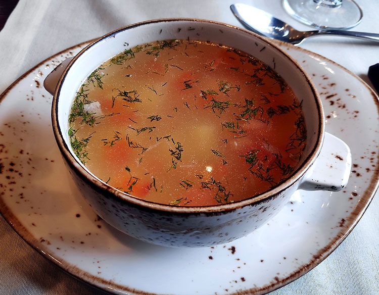 Цены стали демократичнее. Блюда стали несколько проще. Но все равно не так просты – это всегда ресторанный уровень, а не шашлычная за углом. Это не то же самое, что вы готовите дома каждый день (для кого-то, возможно, это минус). Даже на бизнес-ланч. На фото выше – уха с лососем.