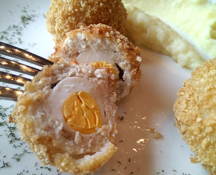 Зразы из индейки с перепелиным яйцом. И почему-то опять с картофельным пюре. Хотя я ведь сегодня хотела заказать стручковую фасоль. Но рука дрогнула.