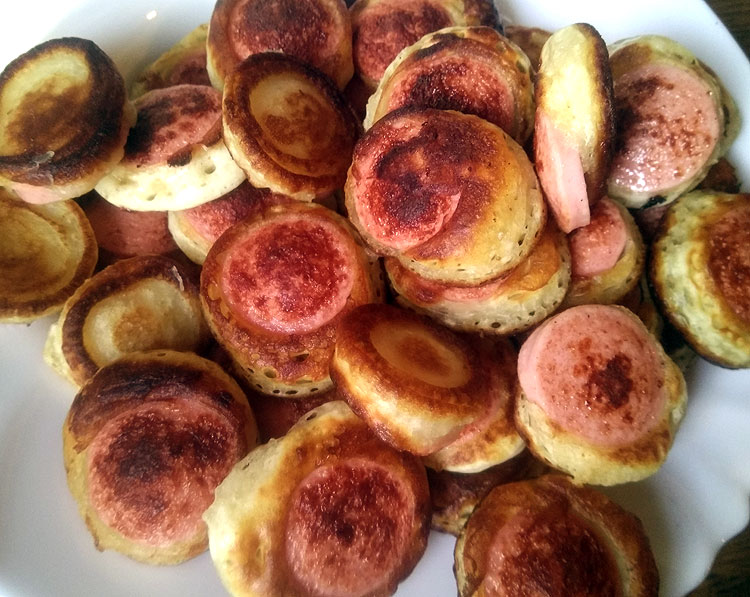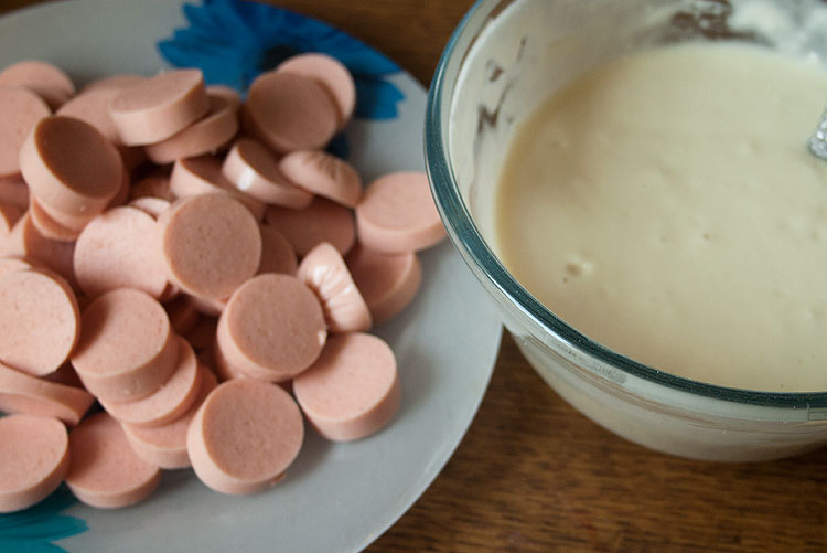 Это блюдо детское. Дети его очень любят. Вообще, все дети любят сосиски в тесте. Но с тестом всегда возня – не всегда хочется. А тут такой ленивый вариант. Тесто сделать как на оладьи. Сосиски нарезать кружочками толщиной 3-5 мм.