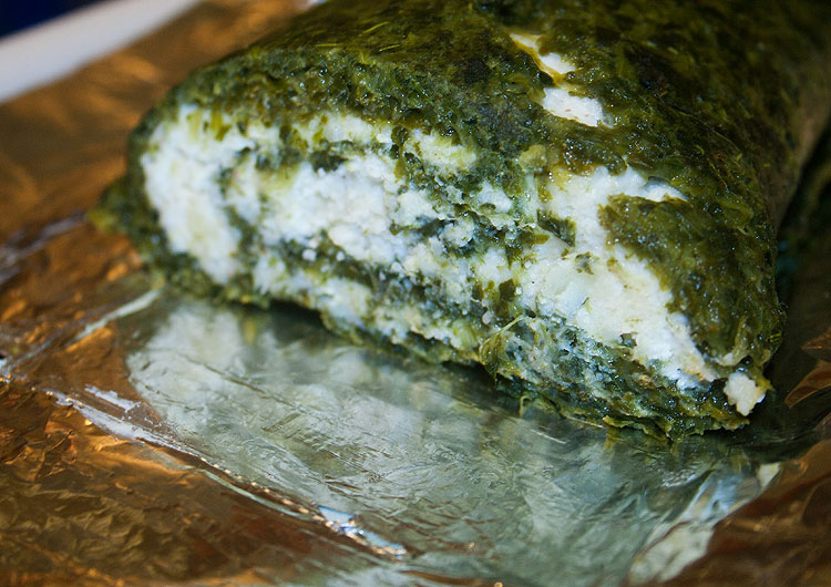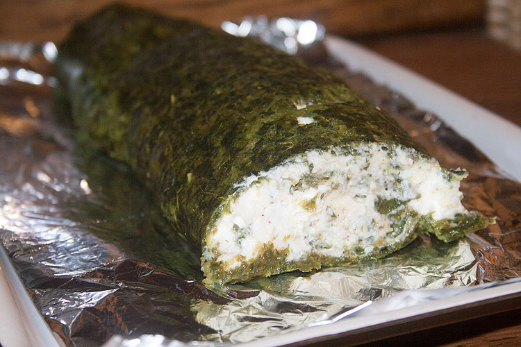 Размазать сырную начинку, свернуть рулетом. По фото видно, что можно даже чуть меньше сырной начинки делать.