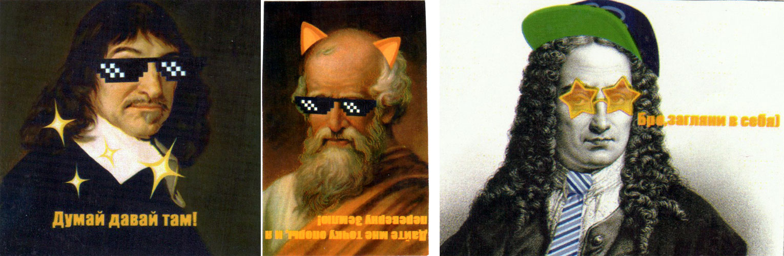 Творческое задание – это по задумке было что-то, что может сотворить студент, которого вдохновила история математики. Я не знаю, что это может быть. Танец/песня/стихотворенье? Например, в прошлом году одна девочка сделала вот такие штуки (в наборе 8 штук) – это стикеры, их можно наклеить себе на ноутбук, например.