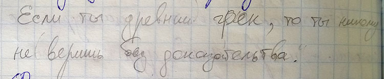 Перевод: Если ты древний грек, то ты никому не веришь без доказательства.