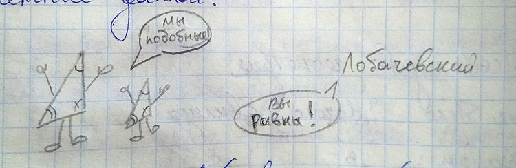 Перевод: “Мы подобны!” Лобачевский: “Вы равны!”