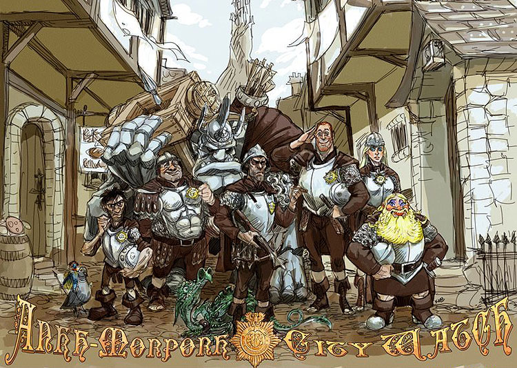 У меня еще всегда “Ведьмы” в качестве иллюстрации Пратчетта висят. Но сегодня повешу “Стражу”. Говорят, “Ведьмы” больше нравятся мальчикам, а “Стража” девочкам. Не знаю, не знаю. Стража офигенная. Ведьмы тоже.