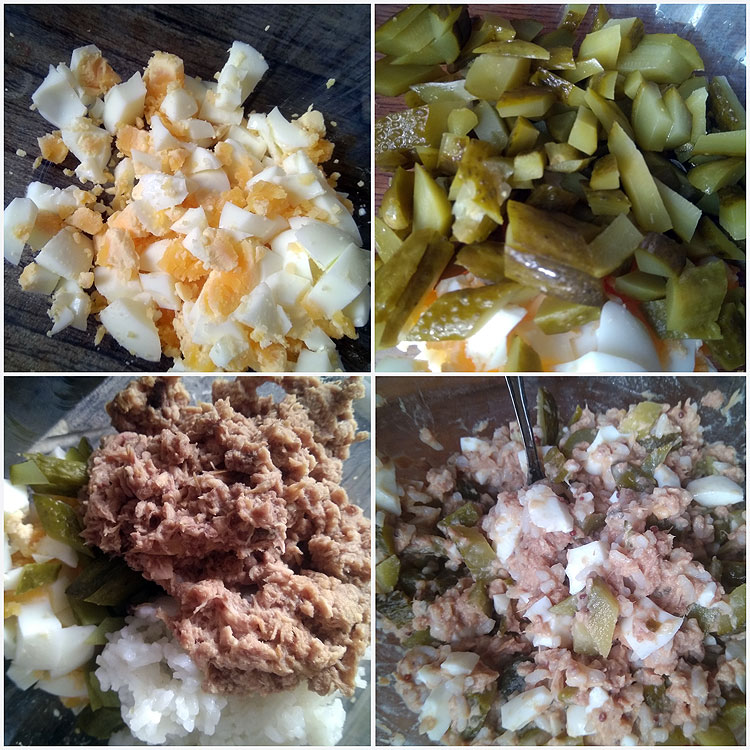 В качестве рыбной консервы тут тунец. На картинке – половинная порция, на один раз поесть нам с мужем (дети рыбу не будут). Риса взяла не стакан, а буквально пару столовых ложек из кастрюли с вареным рисом отсыпала сюда – рис варила для других целей. Заправка – чайная ложка дижонской горчицы (не сильно ядреной, а такой сладковатой). Этого достаточно, если жидкость из консервы (даже не всю, а половину или по вкусу) вылить сюда же.