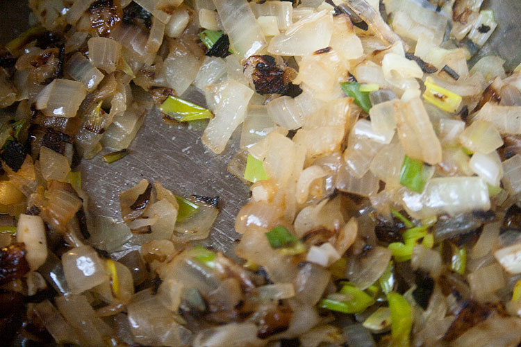 Лук режем мелко или как получится, обжариваем на сковородке, перекладываем в кастрюльку.