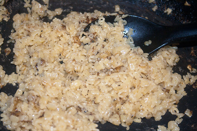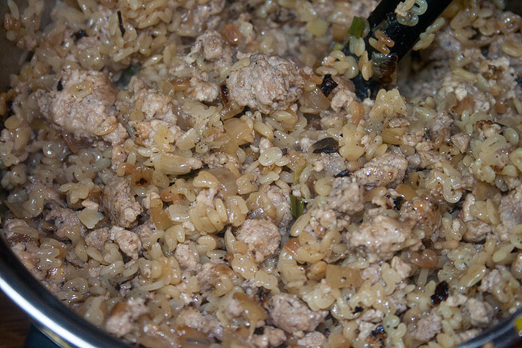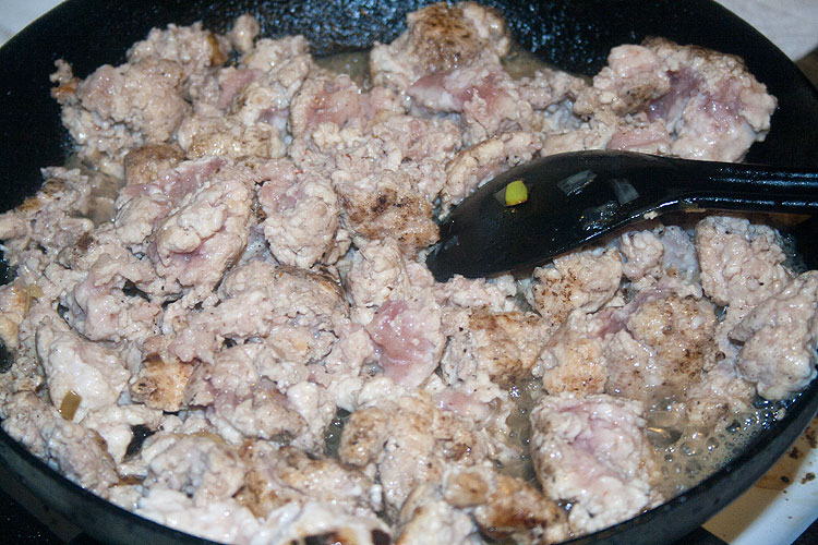На фото – фарш еще не дожареный. Надо его хорошо прожарить, до готовности. При жарке лопаткой фарш разбивать, чтобы не слипался в крупные куски – но тоже без фанатизма. Можно полить пару столовых ложек водички, либо добавить масло, если после лука не осталось.