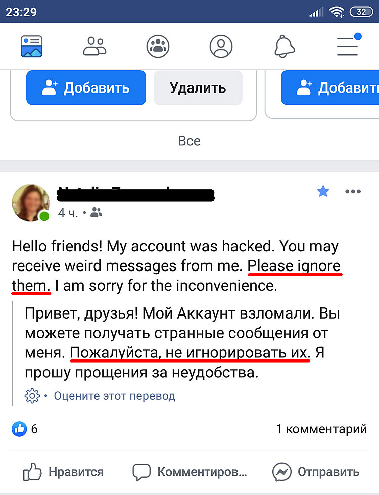 Похоже, те же самые мошенники, которые взломали аккаунт, взломали и встроенный переводчик. Хотя, если честно, с высказываниями носителей языка на обычном разговорном, встроенный переводчик действительно справляется через раз на третий. Но не в этом же случае!