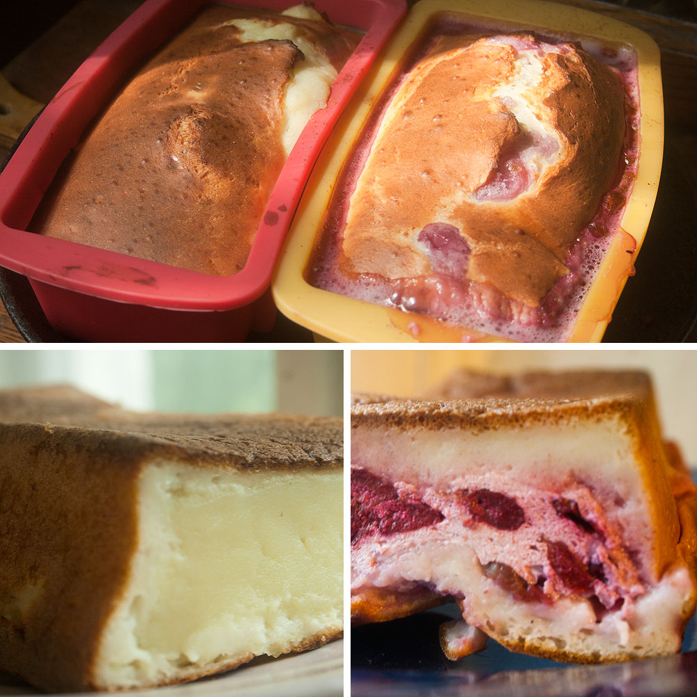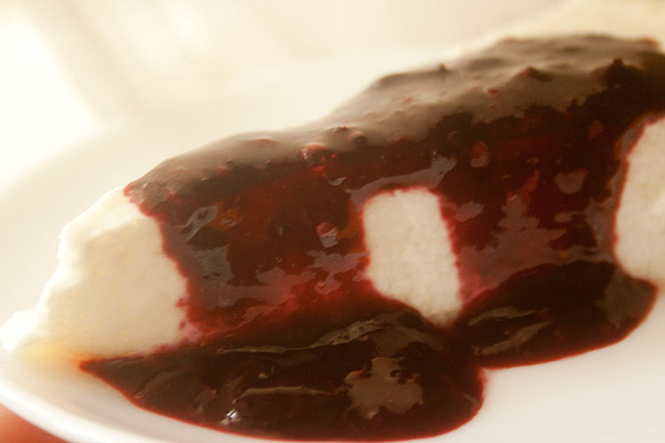 А вот – творожная запеканка, самая простая, очень нежная и с очень нейтральным вкусом, почти не сладкая. До интересного десерта она апгрейдится разными вареньями. Тут – варенье из черной смородины.