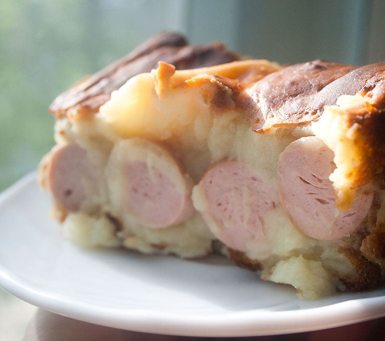 Но сын Денис сказал, что вот он пирожки с картошкой любит, а сосиску с картошкой в тесте – еще больше. И поэтому круто добавить в пирог с картофельным пюре сосиску. Ну, кстати, да. Вполне себе круто. Только резать менее удобно.