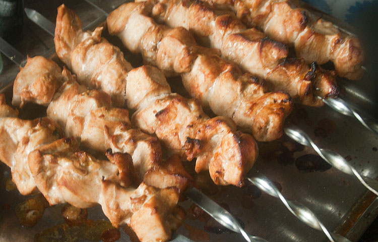 Из мяса у меня довольно часто получаются шашлыки. Это я уже год не могу нарадоваться на функцию верхнего огня в духовке. Прямо крутые шашлыки выходят.