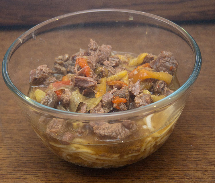 Отдельно сварить спагетти или стеклянные длинные макароны, и залить их этим мясом. Получается что-то типа вока – оч.вкусно!
