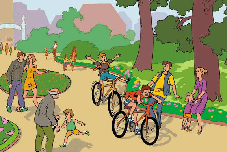 И еще один совет совершенно необходимый. Касается велосипедистов (и на велосипедах, и на самокатах, и на скейтах). Велосипедистов как старше 14 лет, так и младше 14 лет. Вообще всех, кто на транспортном средстве движется быстрее скорости 5 км/час.