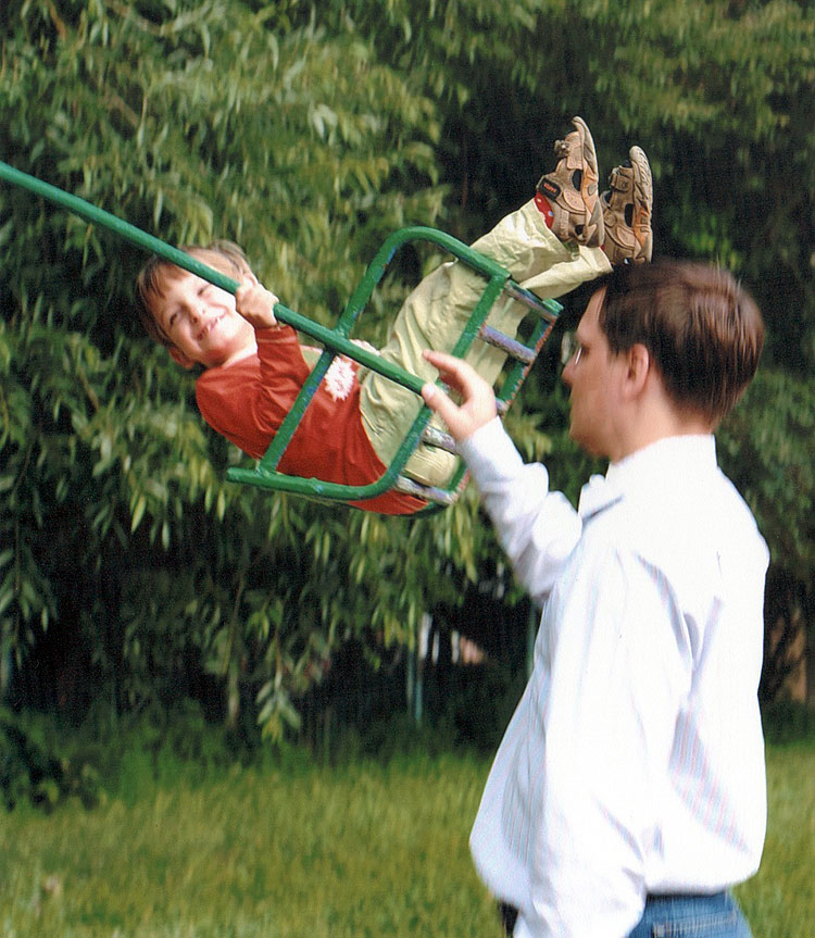 В первый год мы их сначала их придерживали, потом страховали (т.е. руки возле ребенка, но его не касаются) и к самому концу лета стали отпускать. Я понимаю, что высота на этой фотке не впечатляет -- Антону тут год и 8, он скатился с этой горки, она выше меня ростом.