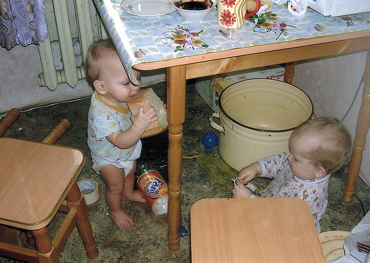 на фото бардак. Дети почему-то в одежде и памперсах (скорее всего, это мы только что пришли с прогулки и просто их не сняли еще). Возраст детей описывается словами “под стол пешком ходят” – т.е. тут им год и два.