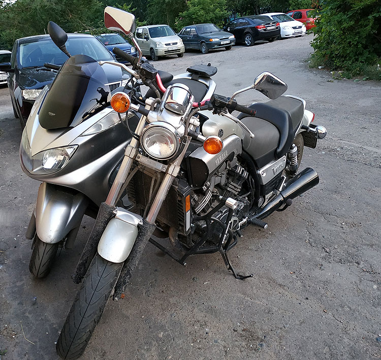 Мотоцикл мужа тяжелее, мощнее, больше жрет бензина, и вообще драгстер. Мой легче, более практичный, более пронырливый и поворотливый, и вообще более дамский вариант. Но оба – Ямахи (в честь чего у нас с мужем рифмованные брелки на ключах). И мой мотоцикл тоже не маленький. Это флагман у Ямахи в данном классе мотоциклов.