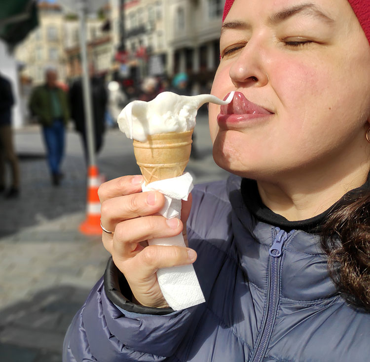 Вообще, часто продается и более традиционное мороженое. И на вывеске тоже будет написано “дондурма”. Короче, надо приглядываться. Местная дондурма отличается тем, что в мороженое добавлен салеп в роли загустителя. Собственно, салеп – это тоже турецкая уличная еда, и про него чуть позже. Но вот эта штука дает мороженому очень необычную структуру. И в частности, дондурма умеет делать так: