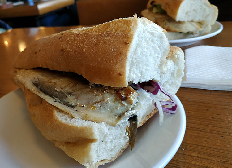 Есть очень традиционная местная еда -- балык экмек. Это рыба, немного овощей и все в гигантской булке.