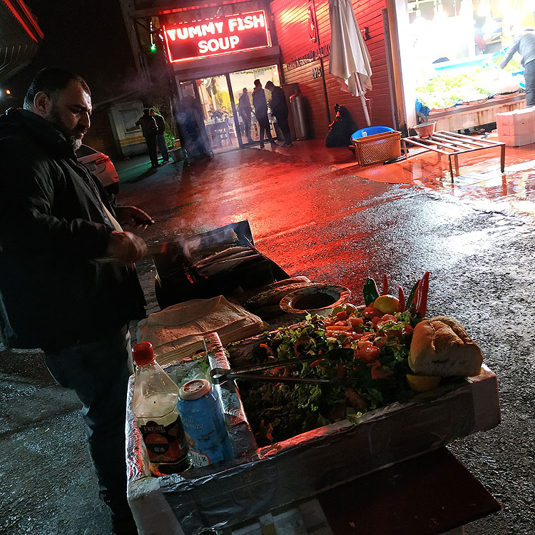 И вот однажды почти ночью. Идем мы мимо закрывающегося рыбного рынка. Темно, фонарей мало, нестерпимо воняет рыбой (потому что рынок как раз моют – смывают все, что нападало на пол из рынка на улицу). И вот – видим мы страшного бородатого турка со здоровым ножом. И ура-ура! Это тот самый балык-дурум (т.е. рыба в лепешке).