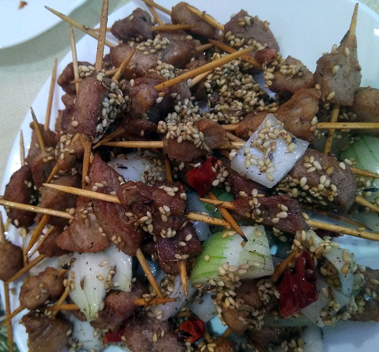 Жареное мясо (свинина, курица или говядина) с кунжутом. Тоже что-то традиционное китайское.
