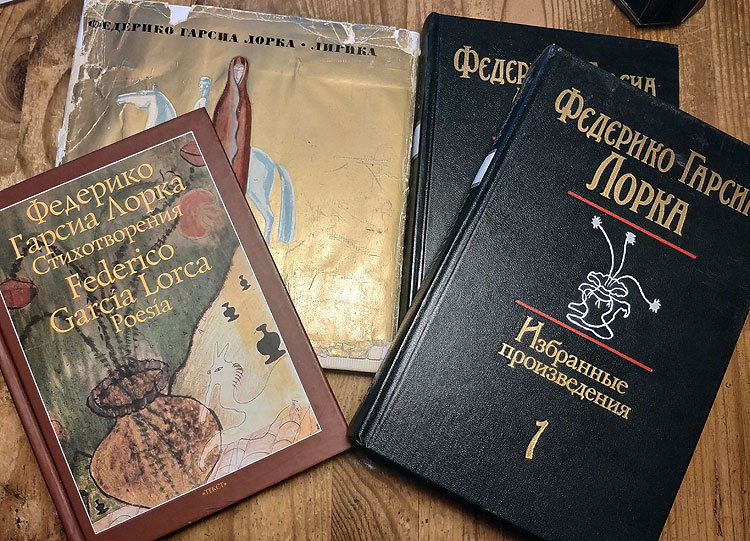 У меня дома такие книжки Лорки. Двухтомник с полным (или почти полным) собранием. Книжка, которую я нежно люблю из детства. И совсем новая книжка, подарок от очень дорогого мне человечка буквально на этот новый год (в новой книжке круто, что перевод+оригинал. Можно сравнивать). В двух из моих книжек этот сонет приведен в переводе Гелескула, в третьей – в переводе Кудинова.