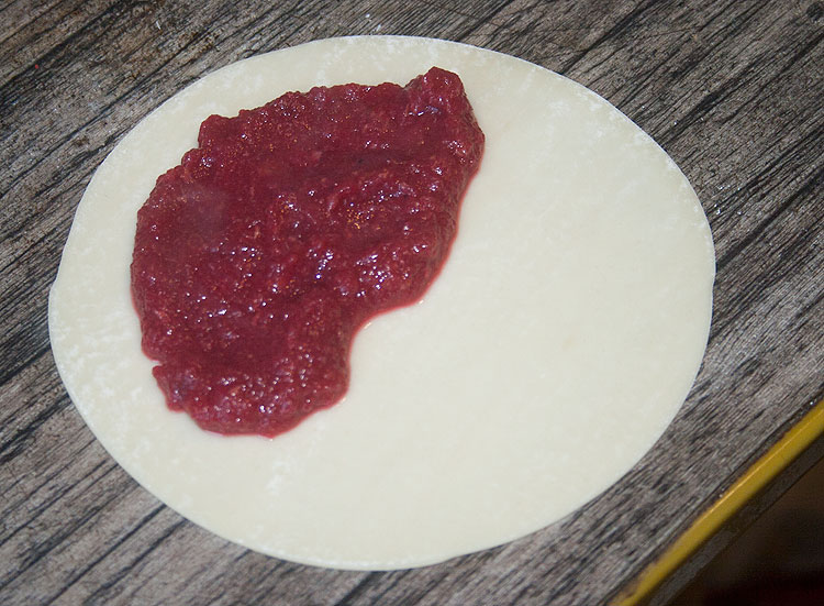 Из пельменного теста и вишнево-яблочного варенья (или не варенья, не знаю, как назвать) – получились такие штуки.