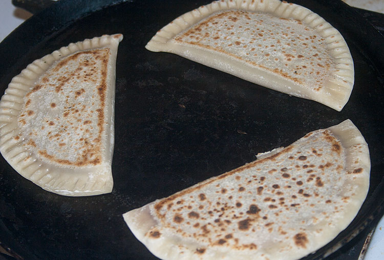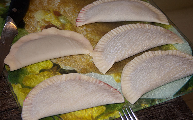 По картинкам не ясен масштаб, но они большие – круг 10 см в диаметре. Это не вареники, потому что несмотря на похожую технологию изготовления, дальше по-другому. Дальше – обжарить на сухой сковороде.