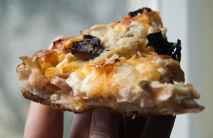 Это почти как пицца, но нет. Это пирог из остатков. Тесто заливное, розовое картофельное пюре, шампиньоны из банки, ветчина, какие-то останки сыра. И для красоты – листики базилика.