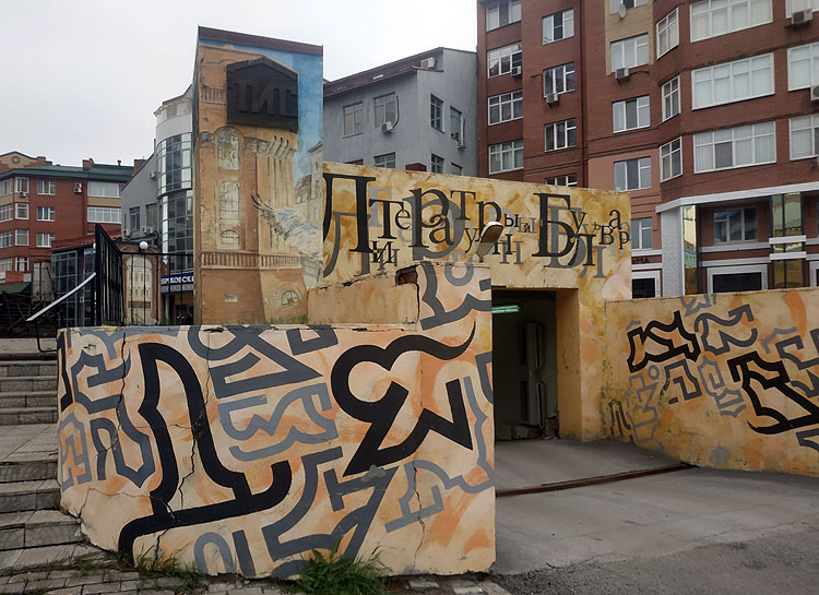 Однако, как фанатам Гребенщикова в принципе может нравиться Мумуй Тролль, так и мы с мужем должны признать (особенно, он, я уже давно признаю), что граффипопс тоже может быть прикольным. Так в Тюмени очень прикольный "Литературный бульвар". Над подземной парковкой есть воздуховоды. Они некрасивые. Короче, на парковку накидали лавочек, а воздуховоды закрасили, придав каждому вид какой-то книги. Идея шикарная.