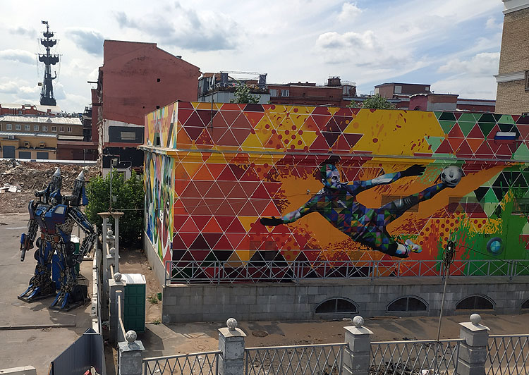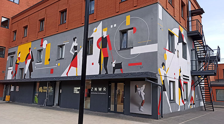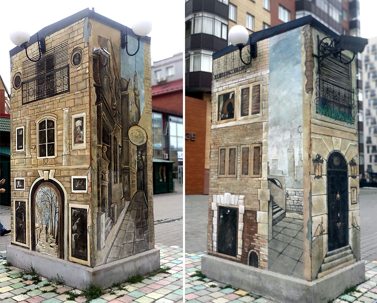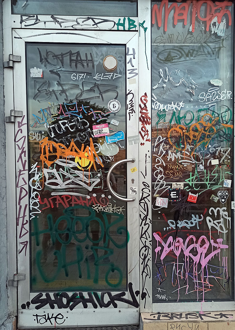 Классическая культура граффити, когда шедевр рисуют в непредназначенных для этого местах с ясным осознанием того, что шедевр этот запросто могут закрасить, а рисовальщика побить, арестовать или как минимум прогнать -- в Тюмени и Москве почти не встречается. /* Вот в Стамбуле или в Палермо -- настоящие граффити в полный рост. */ Встречаются современные граффипопс (граффипопс -- это нет такого термина, но его надо обязательно ввести; если граффити -- это как рок, то граффипопс -- это как рокопопс), когда настенные рисунки используют в рекламных целях (в том числе, и в целях социальной рекламы) или в целях простого украшения города. Короче, когда рисовальщика не просто не побьют, но еще и деньги заплатят.
