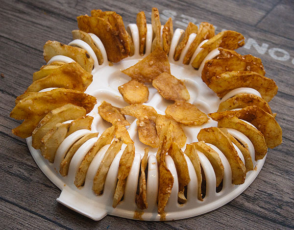 Картошку надо порезать тонко, смазать смесью соли и любимого перца (у меня – кайенский). Можно, если что, смазать бульонным кубиком, превращенным в порошок. (Да, это совсем какой-то сомнительный вариант, но если хочется “чипсы со вкусом говядины” – то вот это самое простое) тут на фото специальная приспособа, но можно без нее, надо просто картошку в один слой разложить прямо на микроволновочном блюде. Если этого мало – то повторить.