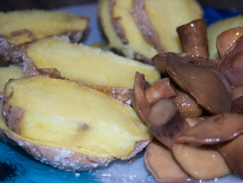 Это картошка из микро, да. Нюанс: картошка щедро натерта солью. Это очень вкусно. И есть надо прямо с соленой шкуркой. Подается с мариноваными грибами. Это объедение, чесслово.