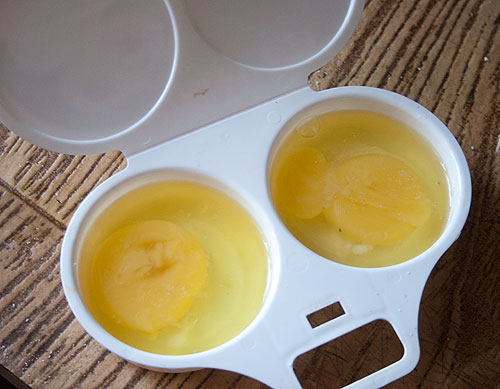 Готовятся 2 яйца примерно 1,5 минуты (ну, в зависимости от того, какой степени готовности желток вы предпочитаете).