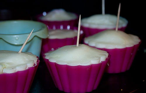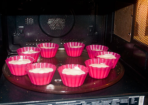 В формочку для маффинов. Столовая ложка теста. Потом столовая ложка начинки. Потом опять столовая ложка теста. Выйдет примерно 8 формочек. В микроволновку на 1,5 минуты. Повернуть все формочки (потому что микра прогревает не очень равномерно) и еще 1,5 минуты. Если почему-то получилось много еды в одной формочке, то за это время они еще не будут готовы (и время надо просто увеличить – все получится). И еще не стоит наливать в формочку много. Они растут вверх (правда, это не страшно):