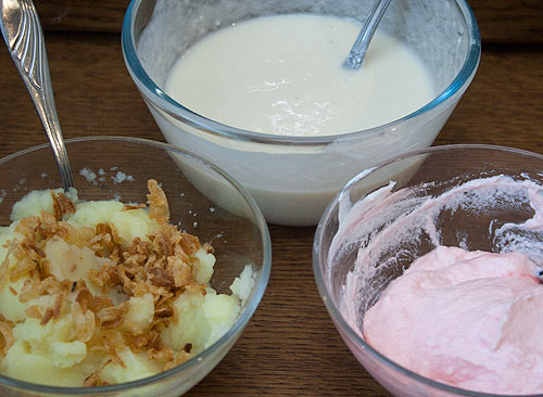 Начинка 1. Картофельное пюре. В данном случае – картофельное пюре, смешанное с жареным луком. Начинка 2. Творожная. 6 столовых ложек творога (это 240 грамм примерно) + 1 желток (если остался от теста; или же 25 грамм яйца, если яйцо в бутылке) + 1 чайная ложка сахара. На фото выше творог розовый. Потому что слащен не сахаром, а сиропом от вишневого варенья.