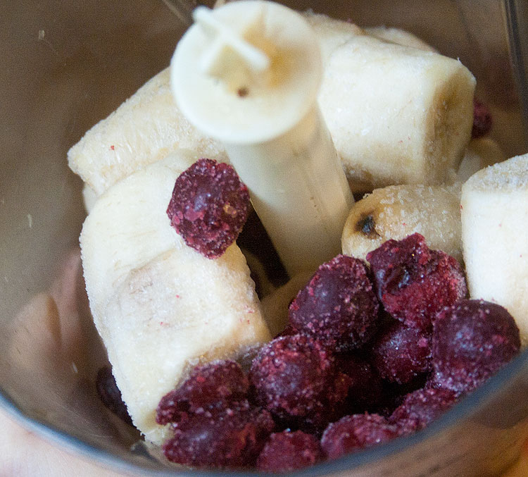 Не размораживая сложить банан в блендер. Добавить добавки по вкусу. Например, вот тут – с вишней.