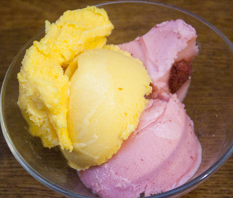 В миске кусок мангового мороженого, кусок клубничного (эти два покупные, как выше) и кусок бананово-вишневого (самодельного, они с клубничным практически одного цвета).