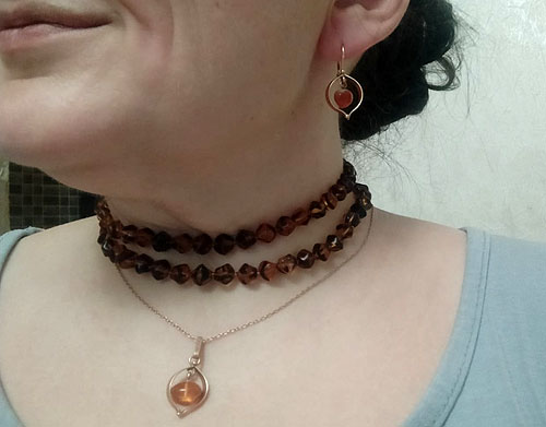 К сережкам я тогда надевала и кулон, и бусики, которые сейчас на фото. Они не янтарные, а из богемского стекла, что ли. Но я их всегда ношу с янтарем. Привезены родителями из путешествия в Болгарию, откуда привезена и я ))) Так что бусики тоже с историей. Бусики тогда на моей шее были в 4 нитки, а на фото всего в две. Не потому, что шея вдвое толще, а просто бусики стали короче. Порвались пару раз, часть бусин утеряна.