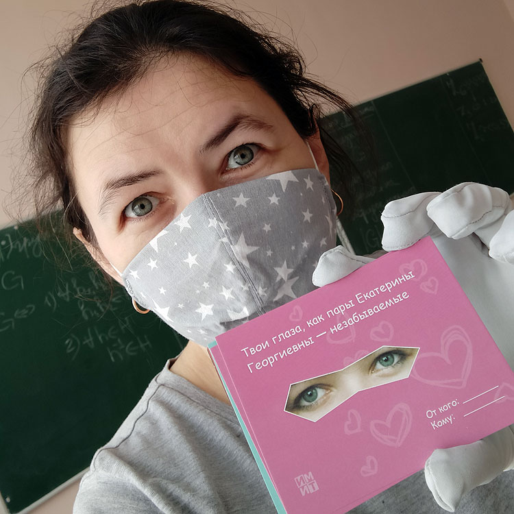 В феврале. От КВ умерла моя бабушка, мамина мама. Мы с мужем поставили второй компонент первой прививки от КВ. Студенты сделали валентинку с моими глазами. Или про мои пары. Я продолжила проповедовать идею, что маска -- это не только красиво, но и стильно. Сходили в кинотеатр после более чем годового перерыва.