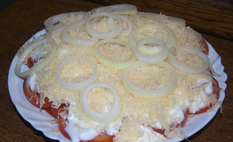 Салат крайне простой. Помидоры кругляшками, лук кольцами, чуть-чуть солить. Сверху полить сметаной, засыпать сыром.