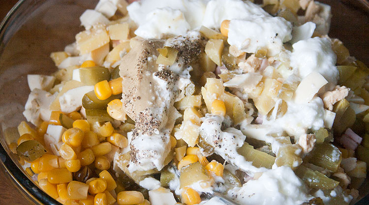 Я не хотела готовить традиционный новогодний салат всея Руси на новый год. Мы его не то, чтобы очень любим. Но утром выяснилось, что у меня остались вареные яйца и пара отварных картофелин. Настругала, добавила ветчины, лука (белую часть от зеленого лука -- тоже осталась от других блюд). Горошка не оказалось -- бросила консервированную кукурузу ))) Яблочко. Я люблю в оливье яблочко.