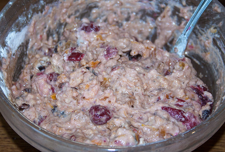 Сухофрукты залить вкусным крепким алкоголем и молоком. У меня был ликер Grand Marnier. Можно любой ликер, коньяк и т.п. На сутки оставить в покое. Потом сварить ягоды вишни в микроволновке, добавить к сухофруктам. Сюда же цедру апельсина, побольше (у меня, конечно, еще и ликер тут сыграл апельсиновую роль, а если ликер не апельсиновый -- то прямо надо!) Муки, разрыхлитель. Специи примерно как для глинтвейна. Гвоздику, корицу, мускатный орех -- ну, чего нагребете. Собственно, все. Тесто как-то так выглядит: